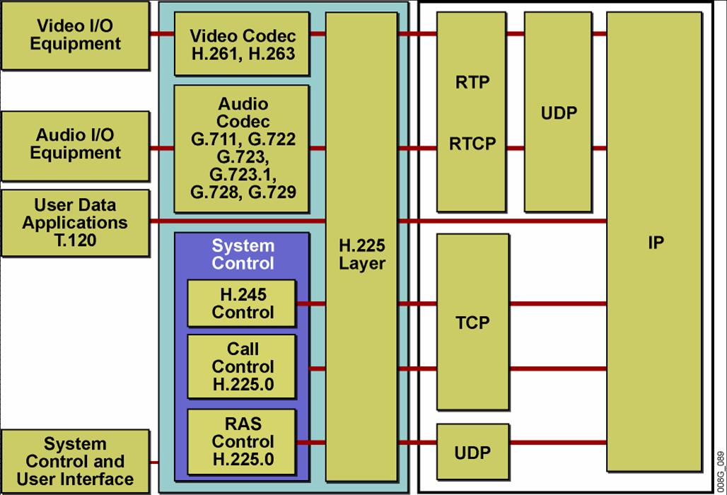 Un Terminale H.323 deve supportare obbligatoriamente comunicazioni audio e, facoltativamente, video e dati. Per fare ciò tutti devono supportare i protocolli di controllo per negoziare l’uso del canale (H.245), per l’instaurazione della chiamata (RAS-Call Signalling) e per la trasmissione stessa dei pacchetti (RTP), oltre ovviamente ai codificatori/decodificatori per i flussi audio e video (dove possibili) e i protocolli relativi allo scambio di dati (T.120), così come mostrato nella figura.