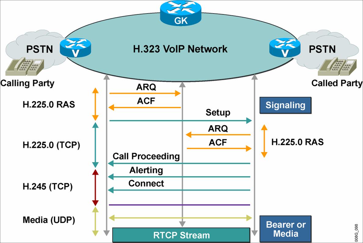 - Gatekeeper–Routed Call Signalling: gli endpoints instaurano il canale di Call Signalling con il Gatekeeper, che, quindi, sarà attraversato da tutti i messaggi H.225.0. Tale procedura permette un forte controllo sulla chiamata da parte del Gatekeeper.